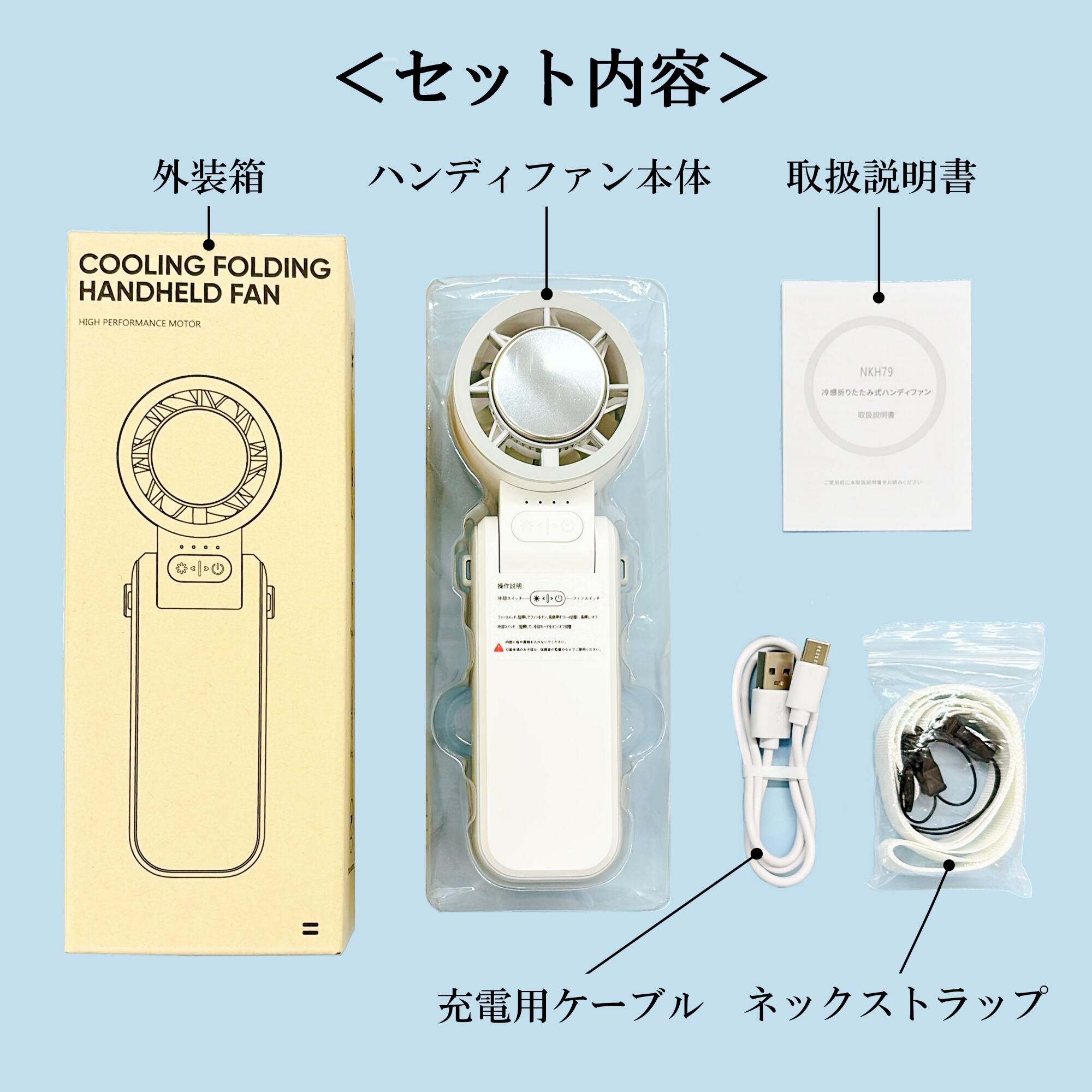 持ち手部分は折り曲げることができ、使用シーンに合わせて調整が可能。さらに、首からぶら下げて使えるネックストラップも付属していますので、移動中でも快適に使用できます。