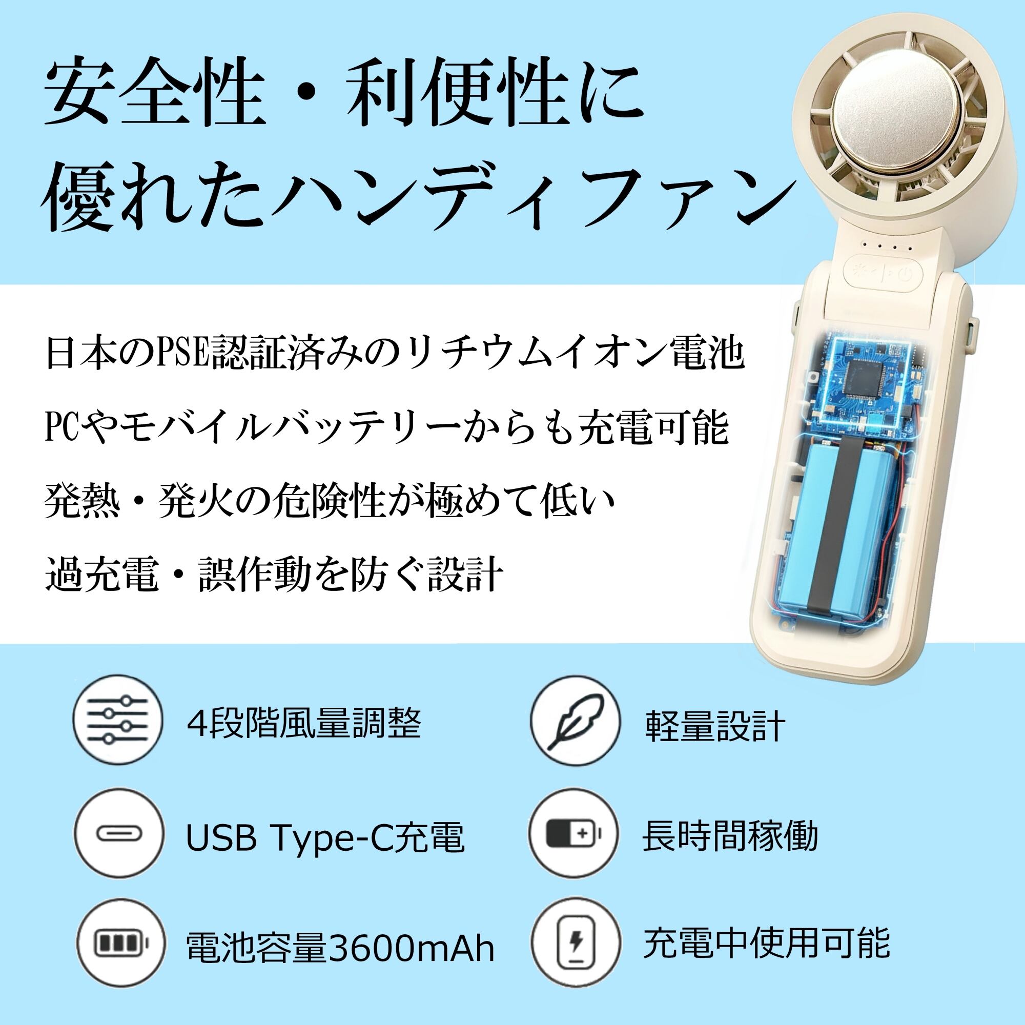 従来型の充電端子から進化したUSB Type-Cを採用し、3600mAh容量の安全なリチウムイオン電池内蔵で、長時間使用が可能です。日本の(PSE)認定品なので安心してご使用いただけます。